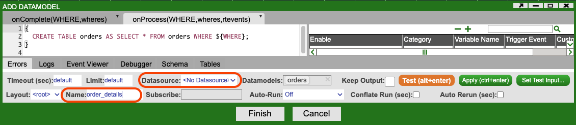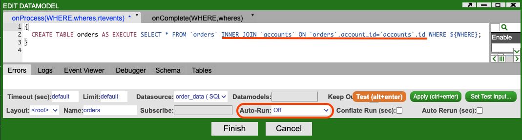 Save the changes made to the orders datamodel by clicking the Finish button. If you are asked if you wish to update the datamodel to match the schema from your test query results, click Apply Changes.