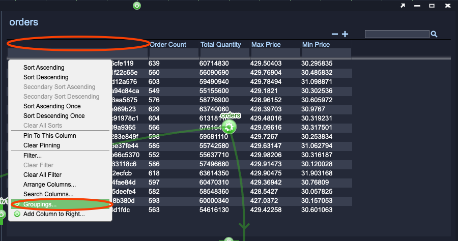 Click on the column header for the Tree portion of the Tree Grid Visualization (to the left of Order Count) and select Groupings.