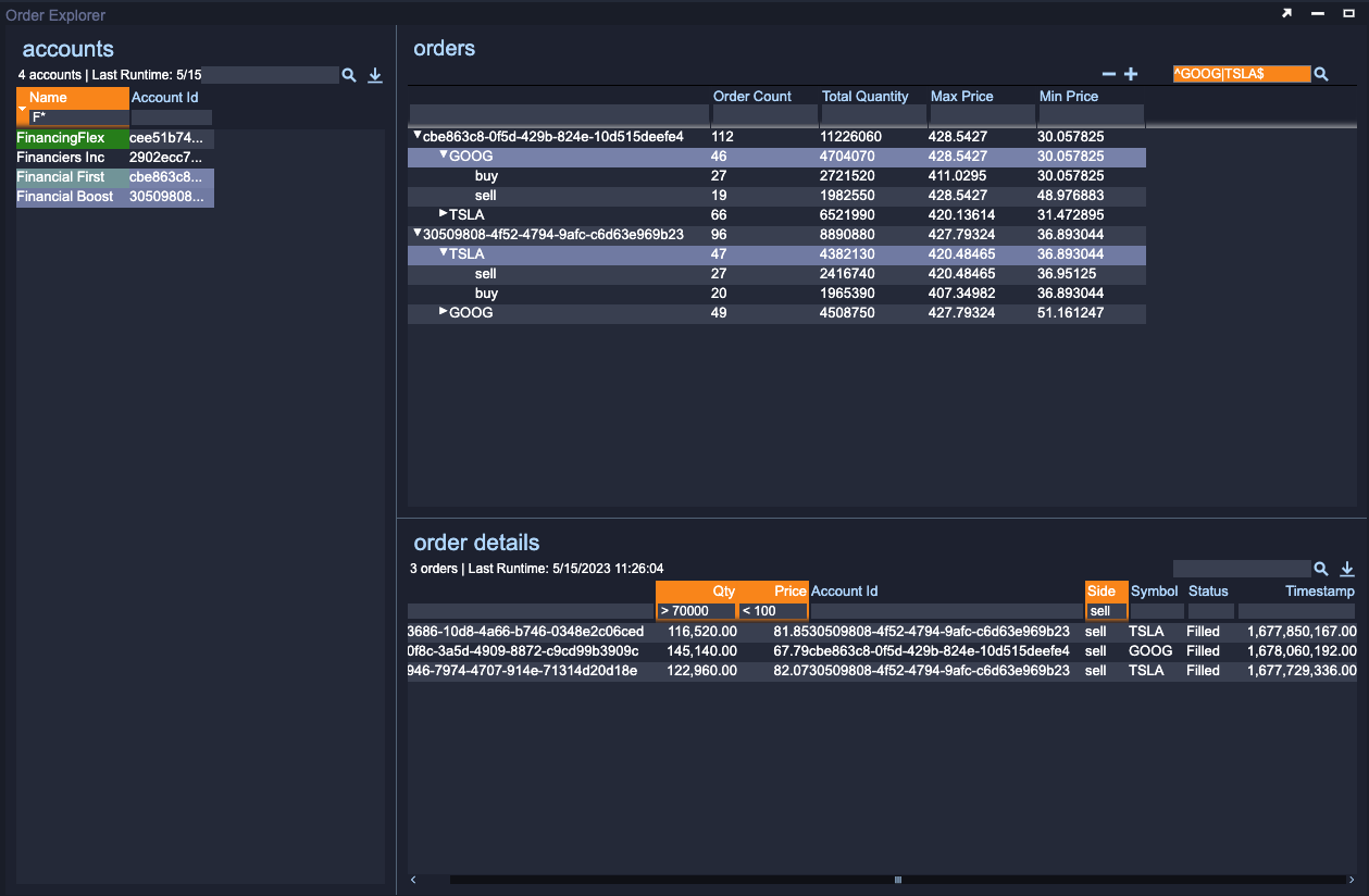 GOOGsymbol is chosen for one account andTSLAfor the other account. The order details Table shows data that matches these selections. - The order details are filtered to only show orders whose quantity is greater that 70,000, price is less than 100 and are sell side.