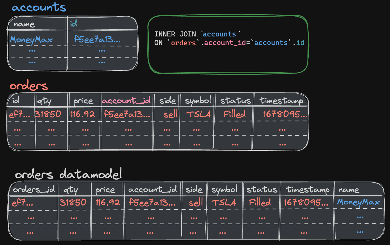 The result of the JOIN clause is that the orders datamodel now contains information on the Account Name related to each order (See the JOIN clause data image above).