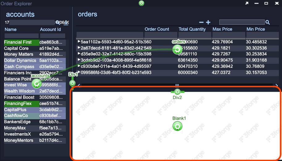 You will now create a relationship between the two order visualizations. This relationship will allow a user to select Account Id and Symbol combinations and see the order details for those groups.