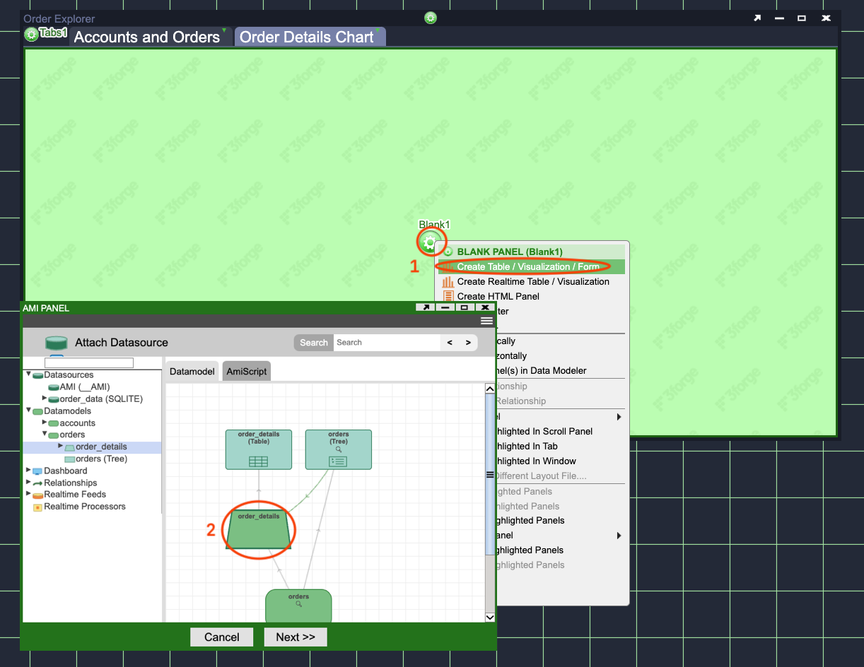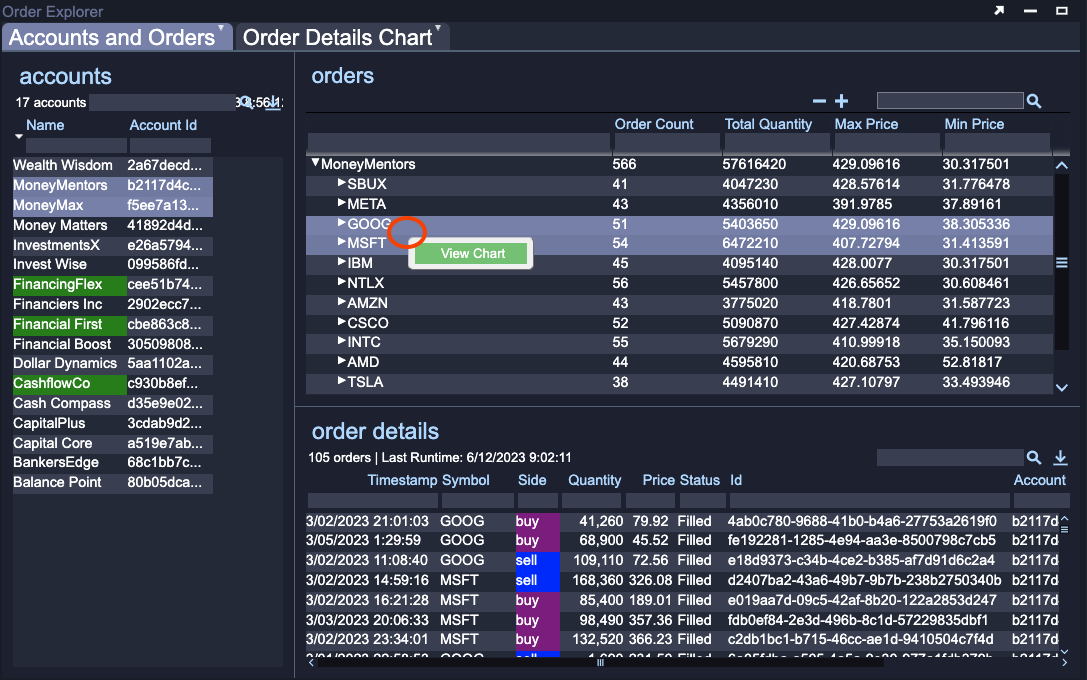 This AMI Script will call the showTab method (function) on the Order Details Chart tab, effectively telling AMI to make it the visible tab. You should now be able to test the context menu by selecting one or more items in the orders Tree Grid Visualization, right clicking and choosing View Chart. The Order Details Chart will be made visible and show you the chart for the orders you have selected.