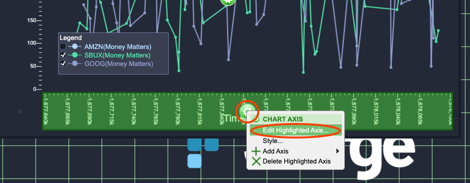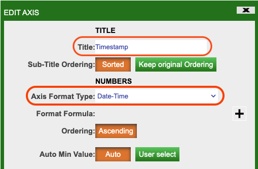 Now that the timestamp is in the correct format, you just need to tell AMI that it should treat it as a Date and Time. Click on the green Gear in the middle of the X axis and select Edit Highlighted Areas.... In the Edit Axis window that pops-up ensure that the Title field is timestamp and the Axis Format Type is Date-Time (see the Configure X Axis image above).