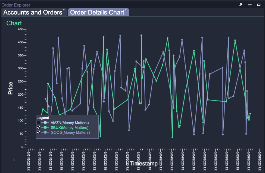 Currently, if you select multiple symbols in the Tree Grid Visualization all of the order data is plotted as one series. You will now make a number of small changes to group the Line Chart data, change the color of the lines and add a key (or legend).