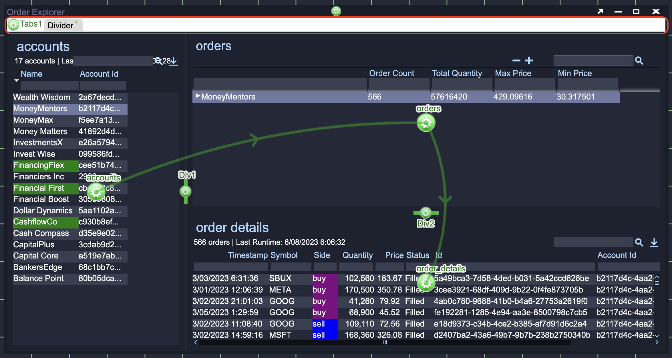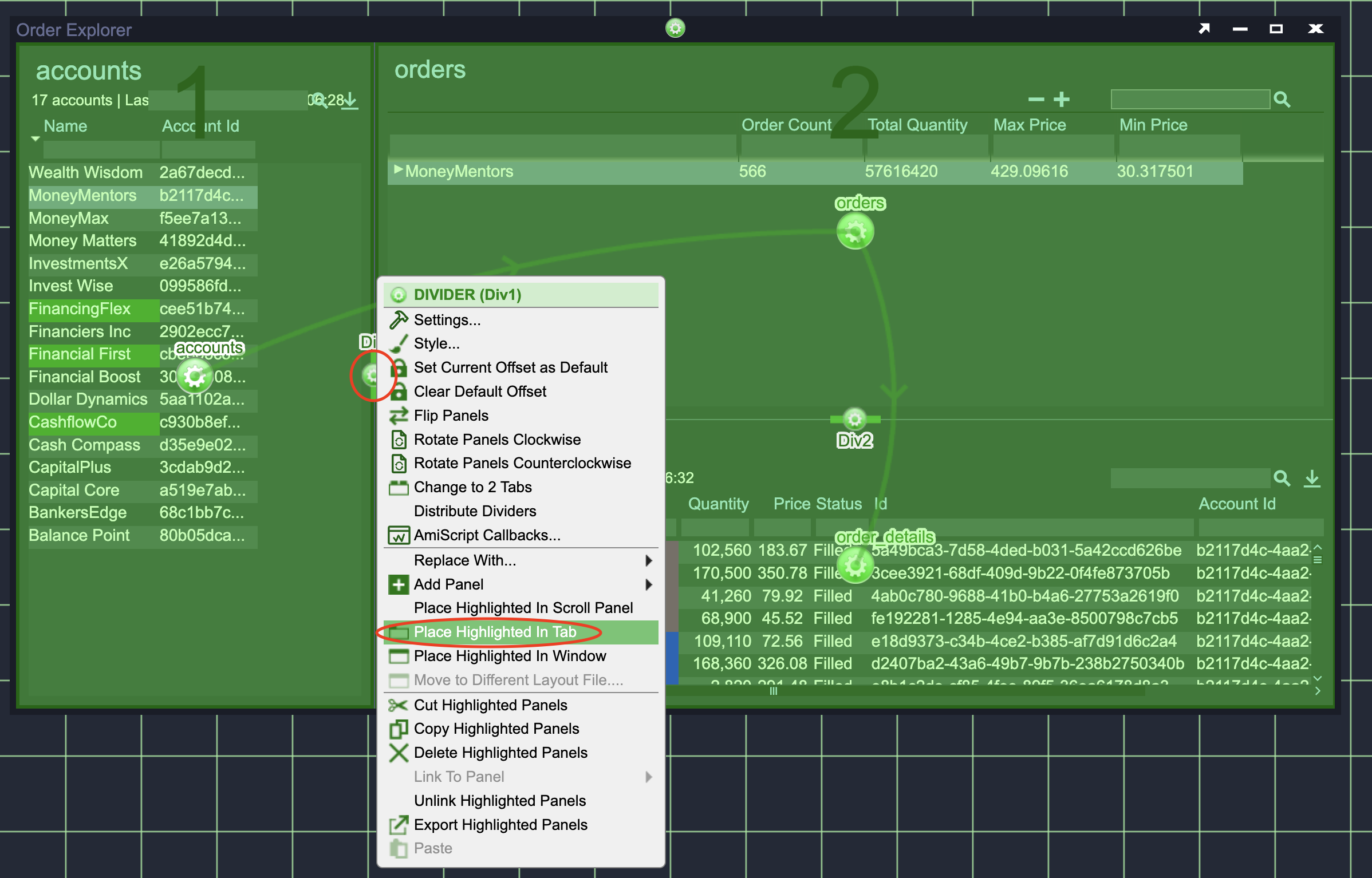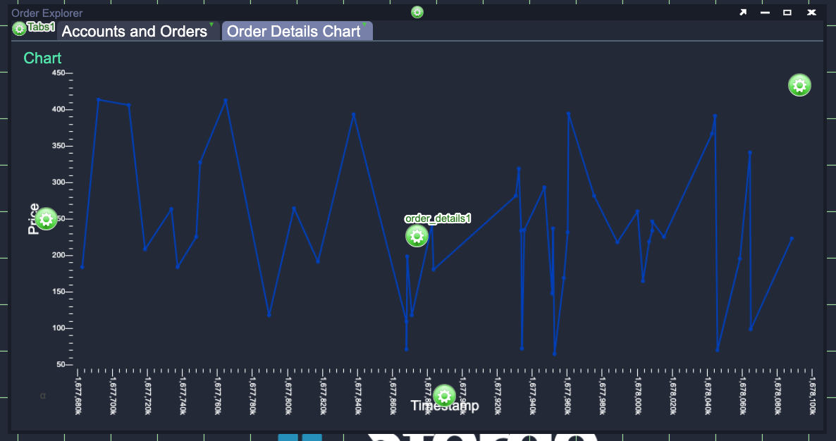 The three visualizations (accounts Table, orders Tree Grid and order details Table) you have created in previous tutorials allow a user to explore textual account and order data. One way to further enhance the presentation of the data would be a graphical representation however there is little space left in which to put one. One option would be to create an entirely new window but then the user needs to manage multiple windows that show related content. A better approach is to make use of AMI tabs which allow multiple visualizations to be contained in one single window. This way related visualizations are grouped in a single window. You will create the Line Chart visualization later in this tutorial, first you will move all of your existing work into a tab.
