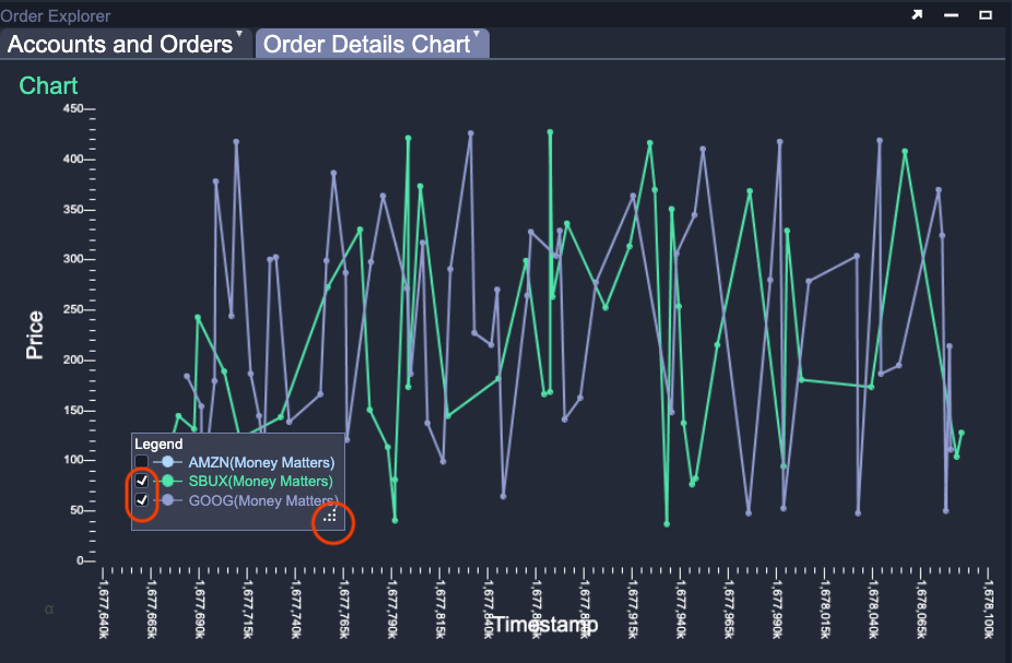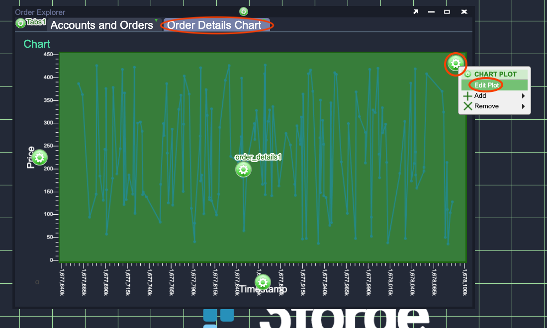 In the Accounts and Orders tab select one account then select two or three symbols from the Tree Grid Visualization. Go back to the Order Details Chart tab and click on the green Gear in the top right of the Line Chart. On the pop-up menu select Edit Plot. See the Edit Plot images below.