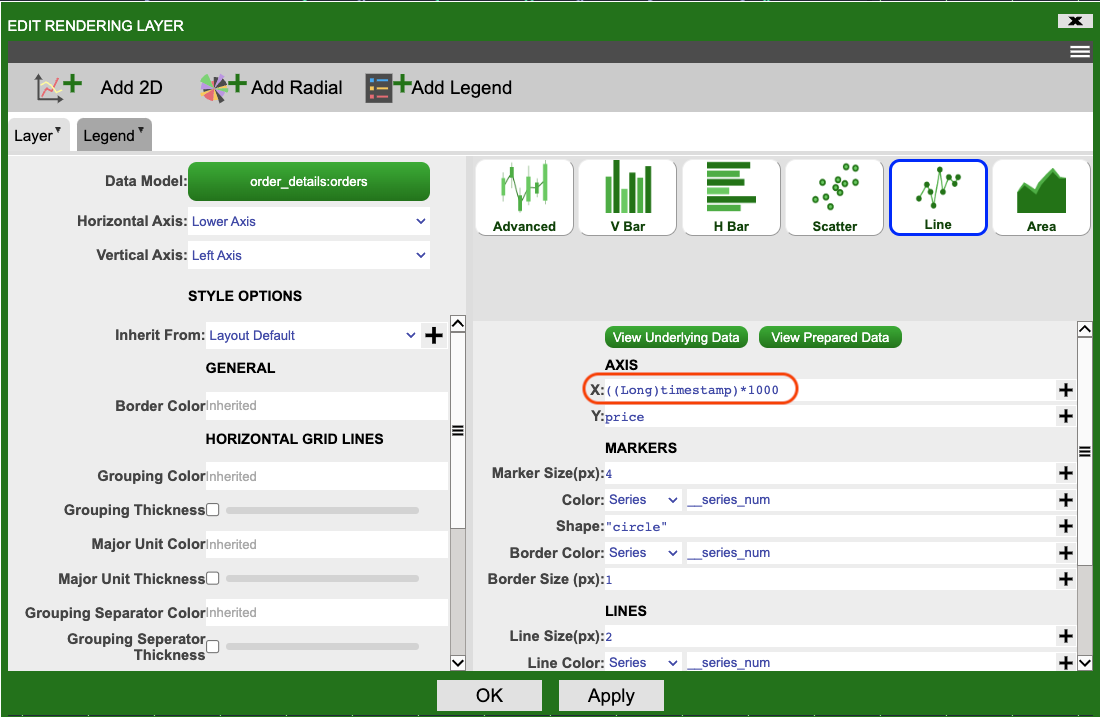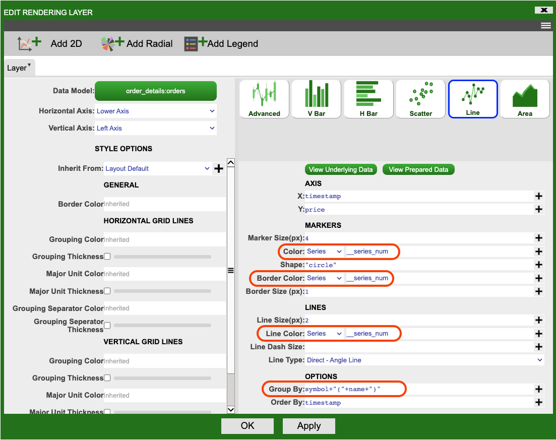 In the Edit Rendering Layer window that pops-up update the Color, Border Color and Line Color fields to fields and __series_num (there are two underscores before 'series'). This will automatically choose different colors for different series (groupings of data). The Grouping Settings image above shows the changes you need to make. Currently there are no groups of data, so update the Group By field to the following AMI Script.