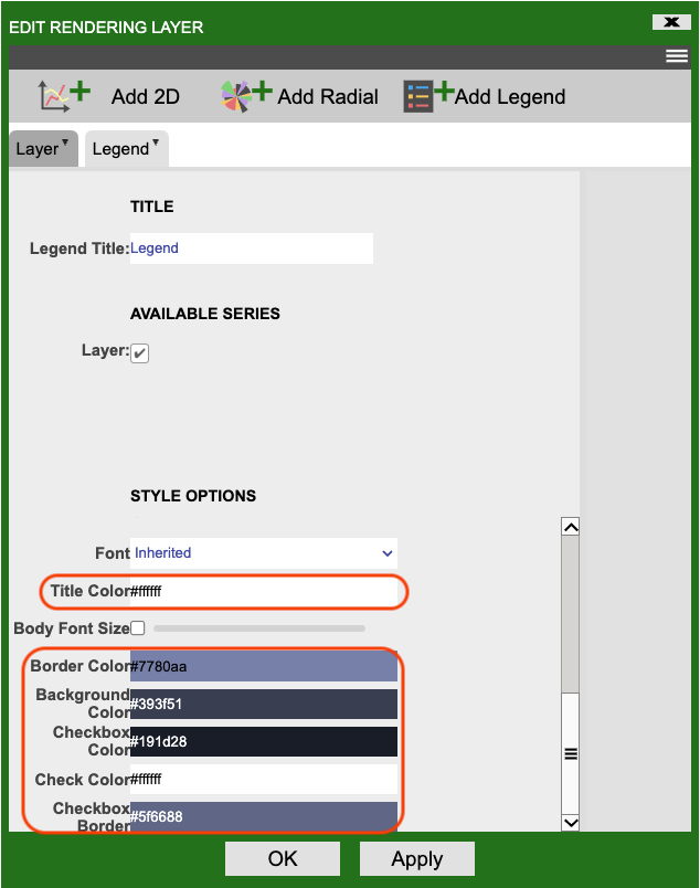 Click Apply to see the default legend applied to the Line Chart. You could leave it as it is or change its style so that it better matches the rest of the Line Chart. The colors chosen are shown in the