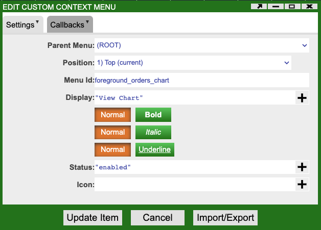 You now need to add a small amount of AMI Script to bring to show the Order Details Chart tab. Click on the Callbacks tab at the top of the Edit Custom Context Menu window.