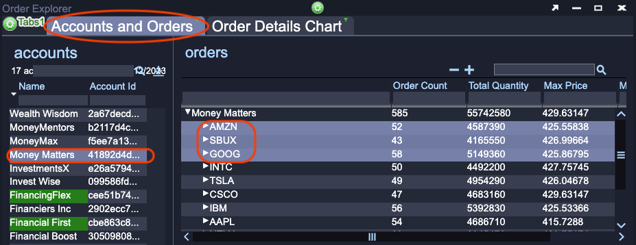 datamodel contained 100 different orders for the symbols AMZN, SBUX and GOOG from the account Money Matters the data would be grouped into 3 groups: