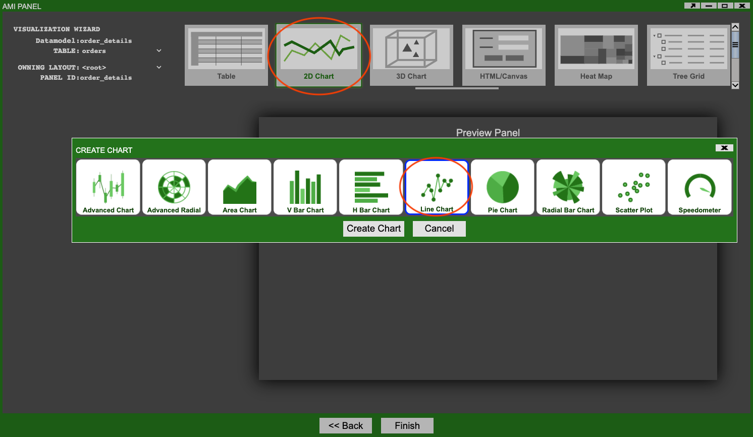 See the Chart Configuration image below. Making these selections will result in the order_details datamodel containing a small set of data that is good for testing the Line Chart configurations you make.