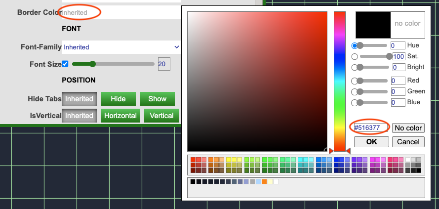 Update the fields shown in the table below to the associated values in the table. This will give the tabs an appearance that matches the rest of the application. To set the color values, click on the field value (eg inherited) and in the pop-up color picking window the color can be pasted into the input box above the OK button (see the Setting Color Fields image below).