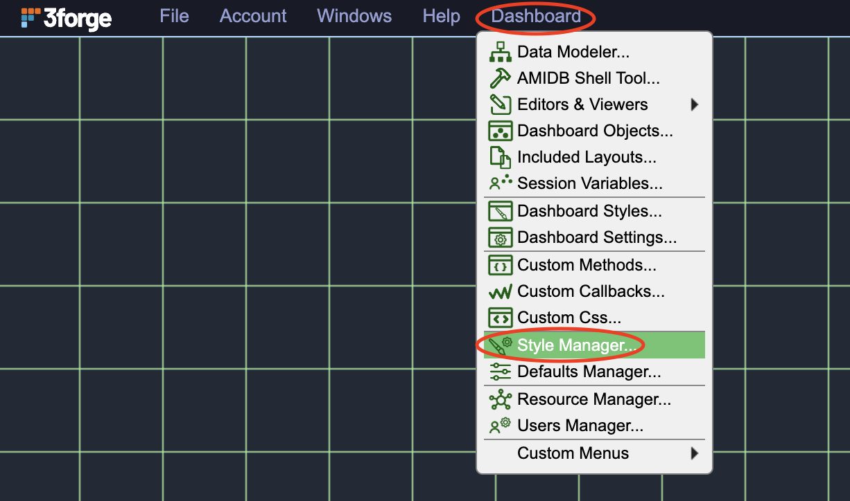 Click on the Dashboard menu and select Style Manager (see the Style Manager Menu image below).