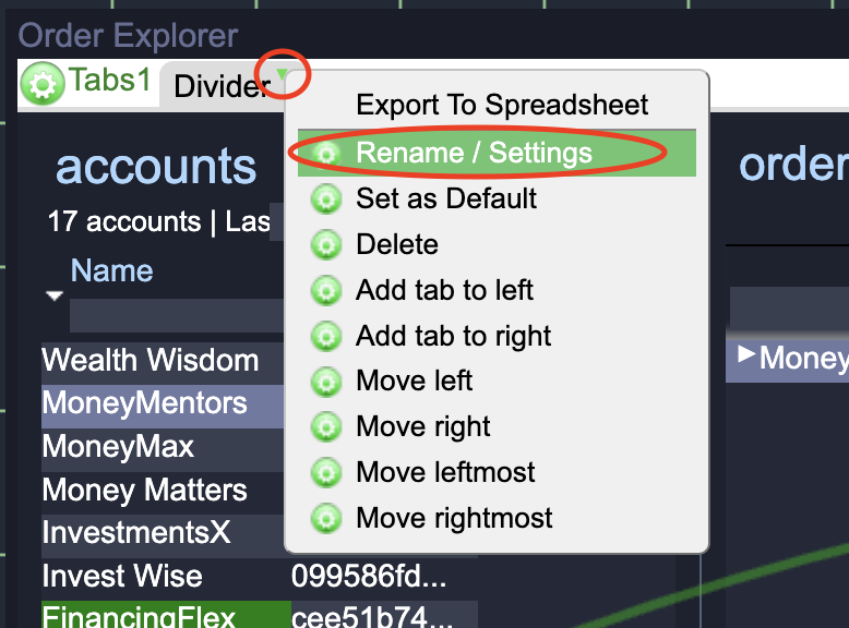 At the top of the Order Explorer window you will see that a new Tab Bar has appeared (see the New Tab Bar image above) with a single tab (called Divider) containing all of the content you previously created.