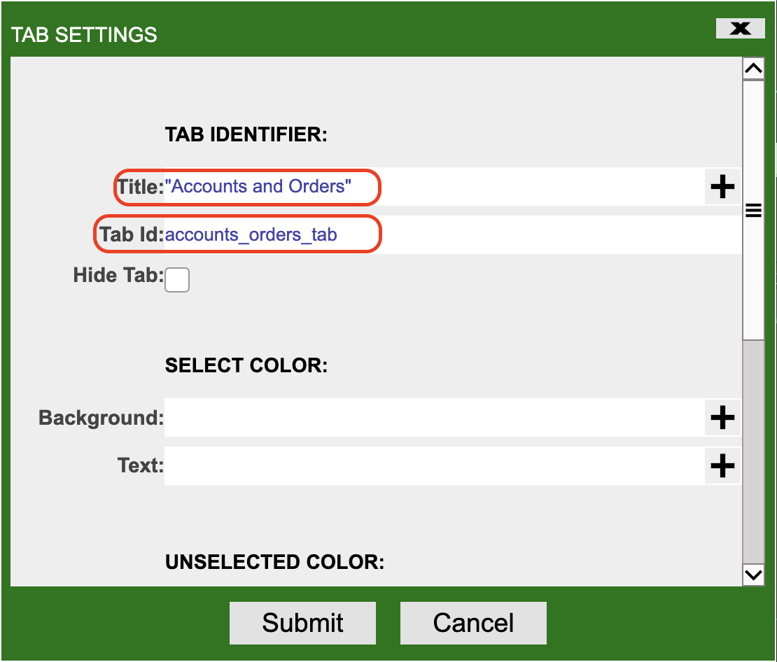 As the tab shows information on accounts and orders a reasonable Title is Accounts and Orders and a descriptive Tab Id is accounts_orders_tab. In the Tab Settings window that pops up, set these two fields.